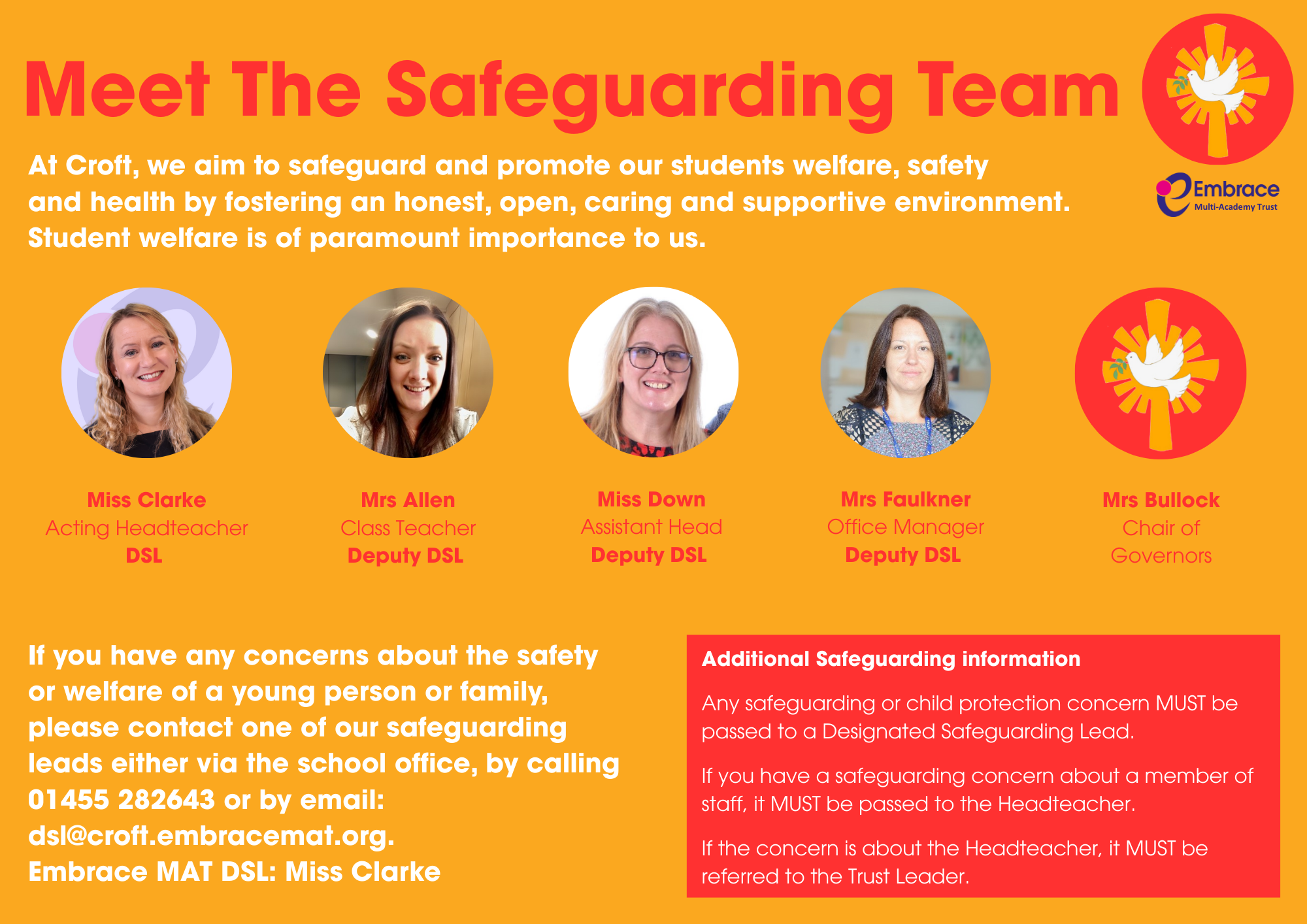 If you have any safeguarding concerns about a child please contact Miss Clarke, Miss Down, Mrs Faulkner or Mrs Allen on 01455 282643 or by email: dsl@croft.embracemat.org.